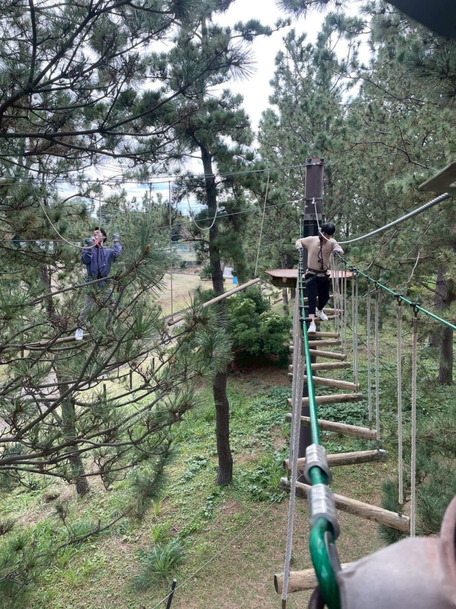 社員旅行で訪れた初島では、アスレチック「SARUTOBI」に挑戦しました。森の中に組まれたコースは想像以上に本格的で、揺れる橋やジップラインに最初は全員ドキドキ。足元が頼りなくて悲鳴や笑い声が飛び交い、日頃は見られない同僚の必死な表情に思わず笑ってしまいました。汗だくになりながらもゴールしたときには達成感でいっぱい。釣れなかった悔しさも吹き飛ぶ、最高の体験になりました。