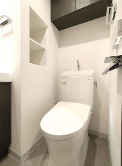 トイレは、温水洗浄便座の機能がついているため、いつでも快適に、清潔に保つことができます。温水洗浄便座が標準装備されています。これにより、寒い季節でも快適に使用できるほか、清潔感を保つことができます。トイレ上やサイドに収納もあります。