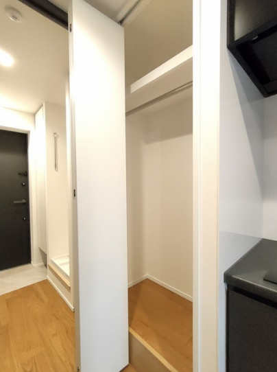 収納は、玄関に設置してあるため靴とのコーディネートもしやすい位置にあります。クローゼットの中は上段とハンガーラックの付いた下段に分かれており、お洋服が多い方でもすっきりと収納可能です。全体が見渡せて取り出しやすい仕様になっています。