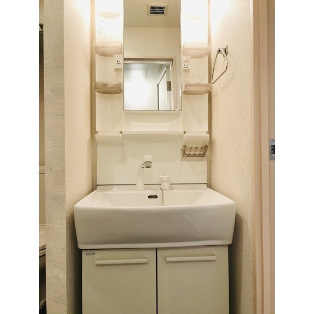 洗面台はバスルームとは別のスペースに設置されており、朝の忙しい時間帯でもスムーズに身支度ができるよう配慮されています。洗面ボウルは陶器製で清潔感があり、広めのカウンターがあるため、歯ブラシや化粧品などの小物を置くスペースに困ることはありません。