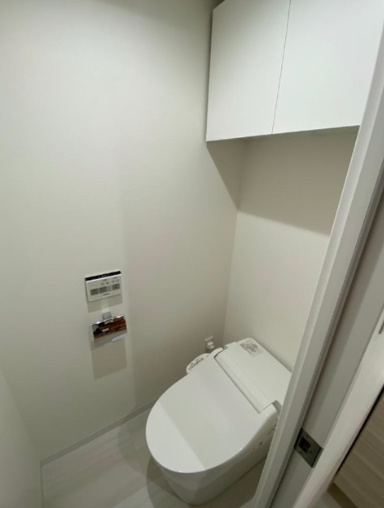 トイレは、温水洗浄便座の機能がついているため、いつでも快適に、清潔に保つことができます。タンクレスなのでスタイリッシュです。温水洗浄便座が標準装備されています。これにより、寒い季節でも快適に使用できるほか、清潔感を保つことができます。トイレ上やサイドに収納もあります。