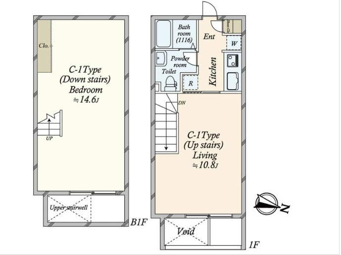ダイニングテーブルと椅子、ローテーブルとソファーを置いても十分に動線が確保できるサイズ感であり、加えてシステムキッチンも壁面に効率よく配置されているため、料理や家事の動線もスムーズです。カウンターキッチンに隣接してテーブルを置いて、コンパクトながら機能的なダイニングスペースを演出することができます。