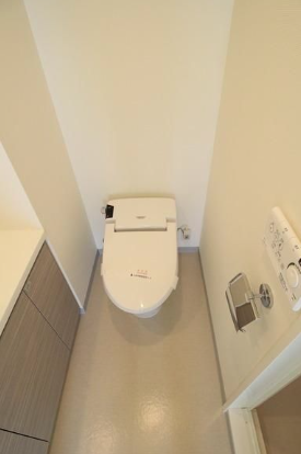 トイレは、タンクレスで温水洗浄便座の機能がついているため、いつでも快適に、清潔に保つことができます。温水洗浄便座が標準装備されています。寒い季節でも快適に使用できるほか、清潔感を保つことができます。スタイリッシュな形でデザイナーズマンションならではのトイレです。