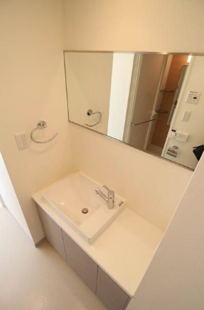 使い勝手の良い独立洗面台が設けられており、朝の身支度や帰宅後のリフレッシュに便利です。鏡の裏や下部には収納スペースが備えられており、化粧品や洗面用具をすっきりと整理できます。洗面ボウルは広めに設計されており、水はねしにくく快適に使用可能。照明も明るく、メイクや髭剃りなど細かい作業にも適しています。清潔感のあるデザインで、日常に上質な快適さをプラスしてくれます。
