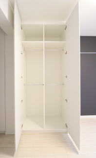 クローゼットの中は上段とハンガーラックの付いた下段に分かれており、お洋服が多い方でもすっきりと収納可能です。奥行もあるので、引き出しなどの収納も設置できます。全体が見渡せて取り出しやすい仕様になっています。