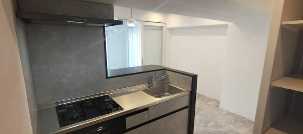 3口タイプで、同時に複数の調理が可能なので時短にもなり、自炊派にも対応できるスペックです。キッチン自体もシステムキッチン仕様で、シンク・収納・作業スペースがバランスよく設計されており、料理しやすい環境が整っています。