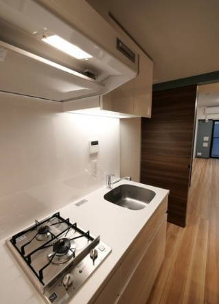 すっきりとしたキッチンになっています。2口ガスコンロ、収納力のあるシステムキッチンが採用されております。調理スペースも広めで作業のしやすい作りになっています。