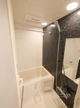 白や色合いが基調になっています。棚も多くあるので小物の置き場には困りません。浴室乾燥機が付いているので、雨の日でも心配なく干すことができます。
