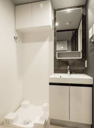 洗面台は鏡裏に歯ブラシや化粧品などの小物を置くスペースに困ることで収納には困りません。鏡は大きく、不自由のない大きさです。