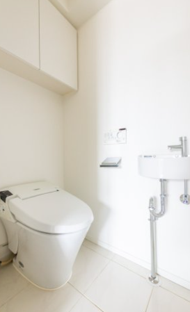 トイレは、温水洗浄便座の機能がついているため、いつでも快適に、清潔に保つことができます。温水洗浄便座が標準装備されています。これにより、寒い季節でも快適に使用できるほか、清潔感を保つことができます。トイレ上やサイドに収納もあります。