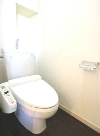 温水洗浄便座(ウォシュレット)を完備し、清潔で快適なトイレ空間を実現。コンパクトながらも足元にゆとりがあり、落ち着いて使用できるのが特徴です。壁や床には汚れに強い素材が使用されており、掃除もしやすく衛生的。トイレ内に棚やペーパーホルダーなどの収納スペースも備えられており、日常生活において実用性の高い仕様です。
