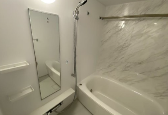 壁面には落ち着いたトーンのパネルが使われていて、白やグレー、ウッド調の色合いが基調になっています。そのため、視覚的にも圧迫感が少なく、ホテルライクな印象を受けます。バスタブはゆったりとしたサイズで、足を伸ばして浸かれる深さと広さが確保されており、一日の疲れをしっかりと癒すことができます。