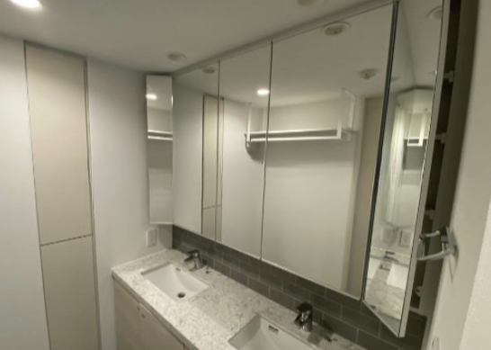 鏡は大きく、明るい照明が上下や左右に配置されているため、顔全体を均一に照らしてくれます。メイクや髭剃りなどの細かい作業もはかどります。
