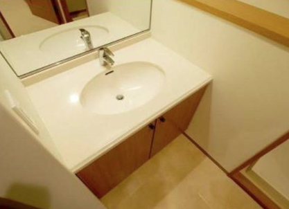 洗面台はバスルームとは別のスペースに設置されており、朝の忙しい時間帯でもスムーズに身支度ができるよう配慮されています。洗面ボウルは陶器製で清潔感があり、広めのカウンターがあるため、歯ブラシや化粧品などの小物を置くスペースに困ることはありません。