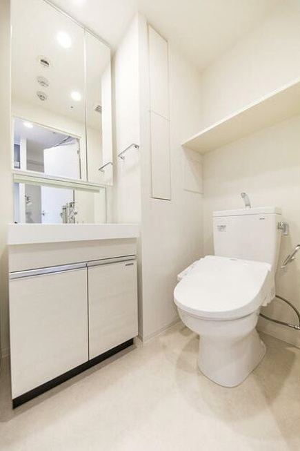 トイレは、温水洗浄便座の機能がついているため、いつでも快適に、清潔に保つことができます。温水洗浄便座が標準装備されています。これにより、寒い季節でも快適に使用できるほか、清潔感を保つことができます。トイレ上やサイドに収納もあります。