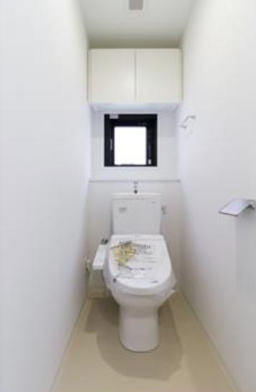 シンプルながらも清潔感のある快適な空間に仕上がっています。温水洗浄便座を標準装備しており、季節を問わず快適に使用できます。スペースには余裕があり、圧迫感がないため、リラックスして利用できるのも魅力のひとつです。また、壁面にはちょっとした収納棚も備え付けられており、トイレットペーパーや掃除道具などをすっきりと収納可能。日々の生活を支える、実用性と清潔感を兼ね備えたトイレです。