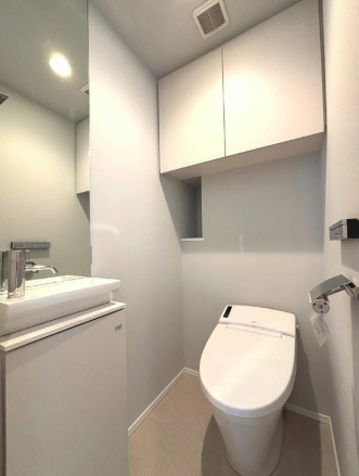 トイレは、温水洗浄便座の機能がついているため、快適に清潔に保つことができます。寒い季節でも快適に使用できるほか、清潔感を保つことができます。トイレ上には収納もあるので、掃除道具などを収納できます。衛生的にも清潔感が保たれます。