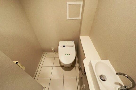トイレは、温水洗浄便座の機能がついているため、いつでも快適に、清潔に保つことができます。温水洗浄便座が標準装備されています。これにより、寒い季節でも快適に使用できるほか、清潔感を保つことができます。トイレ上に収納もあります。専用の手洗い場もあります。