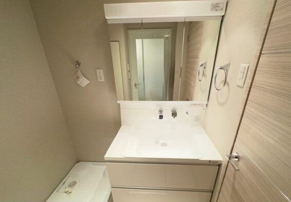 3面鏡の独立洗面台が設置されています。鏡の裏には、収納スペースが設けられていることが一般的で、歯ブラシや化粧品などの小物を整理整頓して収納することができます。