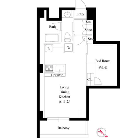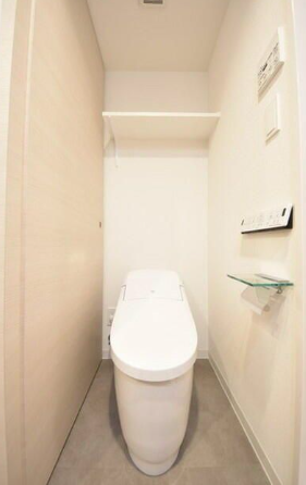 温水洗浄便座(ウォシュレット)を完備し、清潔で快適なトイレ空間を実現。コンパクトながらも足元にゆとりがあり、落ち着いて使用できるのが特徴です。壁や床には汚れに強い素材が使用されており、掃除もしやすく衛生的。トイレ内に棚やペーパーホルダーなどの収納スペースも備えられており、日常生活において実用性の高い仕様です。