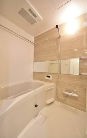 バス・トイレ別仕様で、浴室乾燥機と温水洗浄便座を標準装備しています。清潔感あるシンプルなユニットになっています。