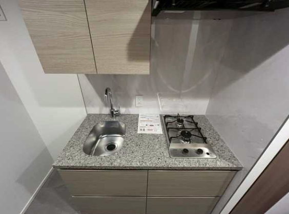 2口タイプで、同時に複数の調理が可能なので時短にもなり、自炊派にも対応できるスペックです。キッチン自体もシステムキッチン仕様で、シンク・収納・作業スペースがバランスよく設計されており、料理しやすい環境が整っています。