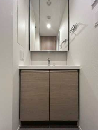 3面鏡の独立洗面台が設置されています。洗面ボウルの上部に縦長の鏡が一枚取り付けられたシンプルでスタイリッシュなデザインの洗面化粧台です。