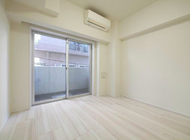 1Kタイプにある洋室は、約6帖あり、単身者にとってゆとりある空間です。フローリング仕様で、白を基調とした内装が明るく開放的な印象を与えます。大きな窓からは自然光がたっぷり入り、通風性も良好です。