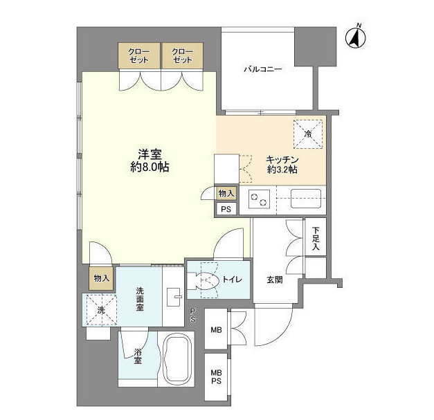 ダイニングテーブルと椅子、ローテーブルとソファーを置いても十分に動線が確保できるサイズ感であり、加えてシステムキッチンも壁面に効率よく配置されているため、料理や家事の動線もスムーズです。カウンターキッチンに隣接してテーブルを置いて、コンパクトながら機能的なダイニングスペースを演出することができます。二面採光なので陽当たりや風通しも抜群です。
