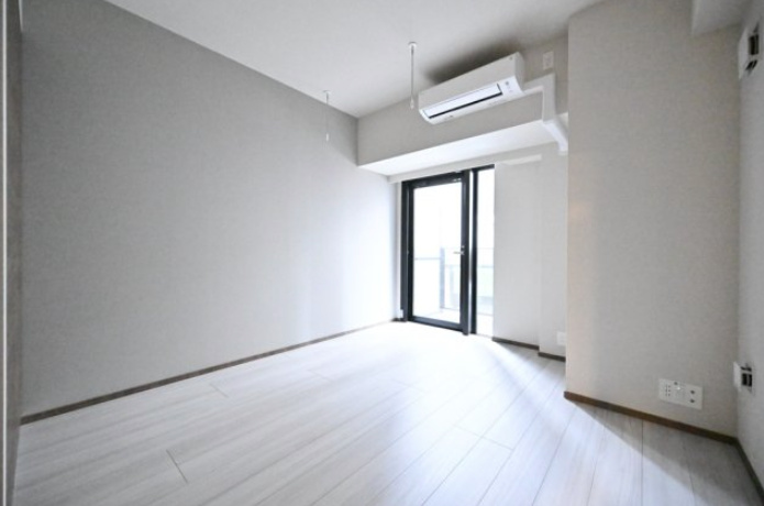 1Kタイプにある洋室は、約7.8帖あり、単身者にとってゆとりある空間です。フローリング仕様で、白を基調とした内装が明るく開放的な印象を与えます。大きな窓からは自然光がたっぷり入り、通風性も良好です。
