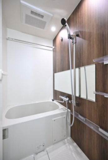 清潔感のあるシンプルなデザインで、使いやすさと機能性を兼ね備えています。浴室には浴室乾燥機が付いており、寒い季節の入浴や雨の日の洗濯にも便利です。浴槽のサイズも一人暮らしには十分で、ゆったりとしたバスタイムを楽しめます。毎日のリラックスタイムに最適な空間です。