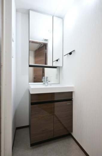 使い勝手の良い独立洗面台が設けられており、忙しい朝の身支度にも便利です。洗面台は清潔感のあるホワイトを基調とし、大きなミラーと収納スペースが付属。歯ブラシやスキンケア用品などを整理しやすく、洗面まわりをスッキリ保てます。
